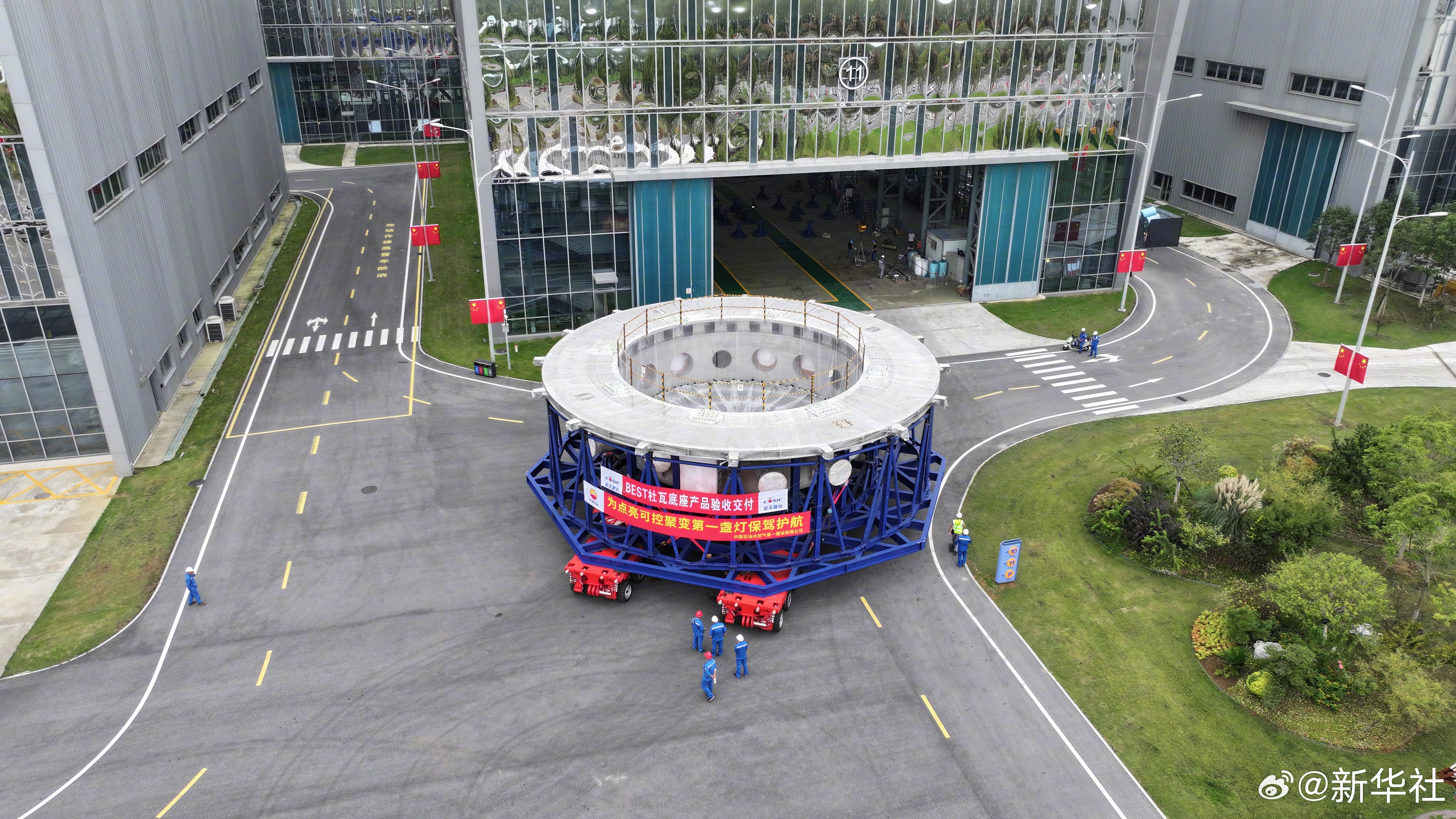 在BEST装置主机大厅,记者看到数条钢缆吊起形如巨大“瓶塞”的杜瓦底座,缓缓放入中央的“深坑”。“杜瓦底座相当于装置的‘地基’,未来将承载整个主机6000余吨设备的重量。”中国科学院合肥物质科学研究院等离子体物理研究所副研究员黄雄一告诉记者,该底座重400余吨、直径约18米、高约5米,不仅是BEST主机中最重的单体部件,也是国内聚变领域迄今最大的真空部件。研制过程中,项目团队突破高精度成型和焊接、毫米级形变控制、高真空密封等关键技术。